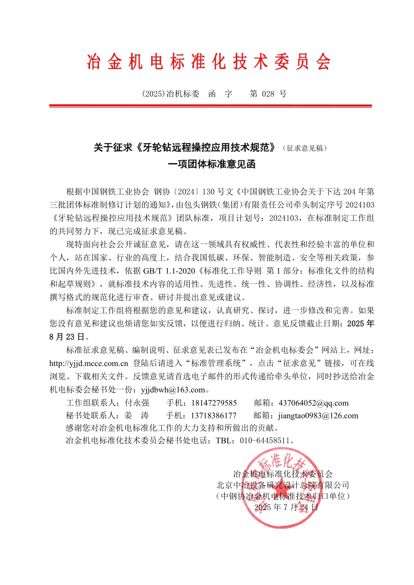 关于征求《牙轮钻机远程操控应用技术要求》(征求意见稿)一项团体标准意见函
